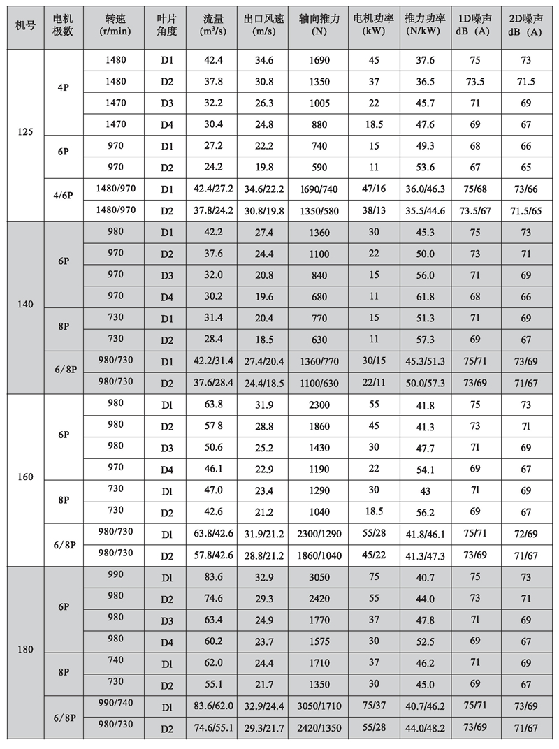 5)性能參數表中所列噪聲值為在野外、距風機出口10米、45度角處測量的A聲級